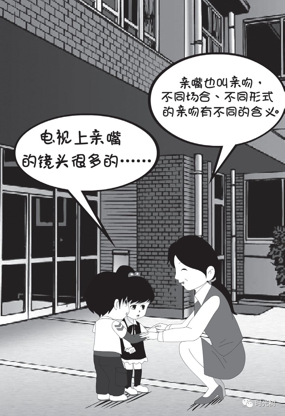 “不过,亲嘴主要是相爱的大人们做的事儿,小朋友之间应尽量避免,因为你们还没有长大;而且,亲嘴有时可能互相传染疾病,在传染病流行季节和地区,就更应该避免。知道吗?”